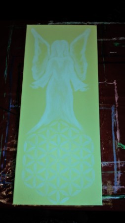 Engel mit Blume weiß auf gelb / Acrylfarbe auf Leinwand / 40 x 70 cm
