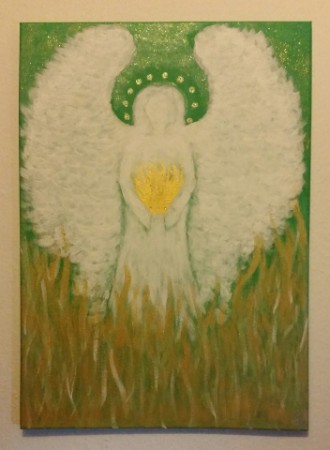 Engel weiß mit gold auf grün / Acryl auf Leinwand / 50 x 70 cm